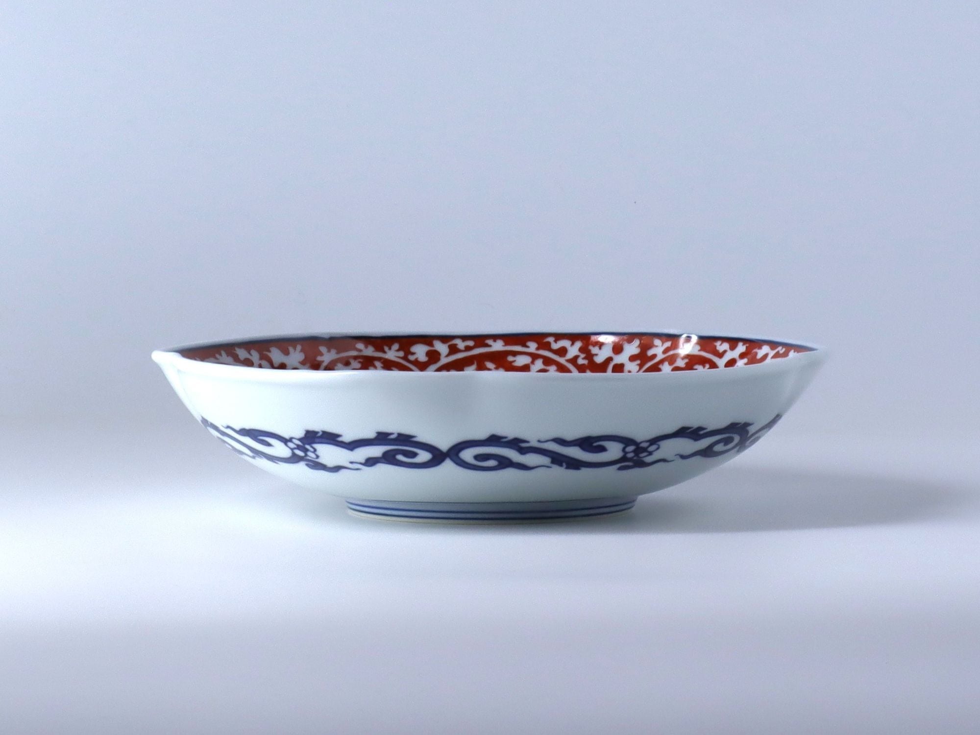 染付の藍色と朱赤色の唐草紋が華やかに映える一品です。